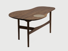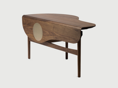 The Butterfly Table, designed by Finn Juhl in 1949, is a very exclusive table. It was practically never produced at its time of creation. Displayed alongside the iconic Chieftain Chair, Chieftain Sofa, and Egyptian Chair during the famous 1949 Guild Exhibition, the Butterfly Table was on behalf of cabinetmaker Niels Vodder. The table is manufactured in walnut with a circular brass inlay.