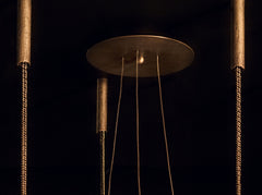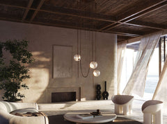 Warmly lit by impressive hand-blown glass globes and suspended by multiple bold chains, this collection is available in either large or small size bringing versatility and poetry to any space.