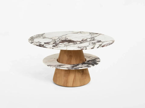 Two layers of beautiful Breche Violette marble rest on cone-shaped oak legs to create a unique, functional coffee table.