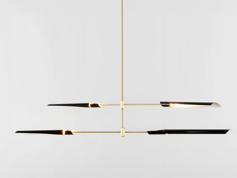 Boden is a sculptural fixture emanating from irregular balancepoints. Designed to be versatile in application, the componentsfeel equally refined as a single piece, or installed as repeating architectural elements, or groups. The Boden shades contain a dimmable LED source and rotate to cast light directionally. The design is intricate, refined, and elegantly efficient.